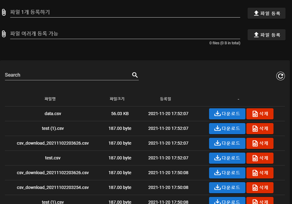파일 첨부 역할을 하는 컴포넌트 1개와 엘라스틱서치에 저장된 데이터를 가져와 리스트를 보여주는 테이블 컴포넌트 1개 이렇게 2개의 컴포넌트로 구성되어 있다.