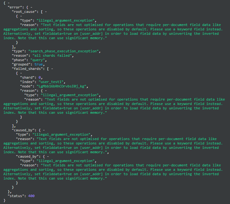 response: '{"error":{"root_cause":[{"type":"illegal_argument_exception","reason":"mapper [user_addr] cannot be changed from type [text] to [keyword]"}],"type":"illegal_argument_exception","reason":"mapper [user_addr] cannot be changed from type [text] to [keyword]"},"status":400}',