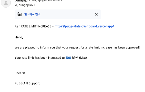 펍지 측으로부터 내가 사용 중인 API 키의 요청수 제한을 올려줬다는 답장을 받았다.