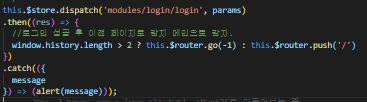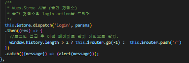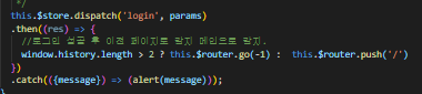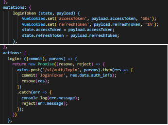 아이디, 패스워드 창에 정보 입력 후 로그인을 하면 store 쪽에 만들어져 있는 login actions에 던져서 정상적인 정보면 토큰을 발급 후 mutations에서 쿠키에 세션 정보를 저장한 뒤 이전 페이지 또는 메인 화면으로 이동시킨다.