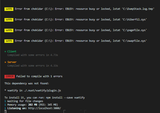... vuetify를 설치하라고 해서 다시 설치하고 실행하니 잘 된다. (npm install vuetify)