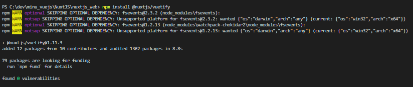 npm install @nuxtjs/vuetify와 npm install vuetify 이렇게 2개를 설치해준 다음